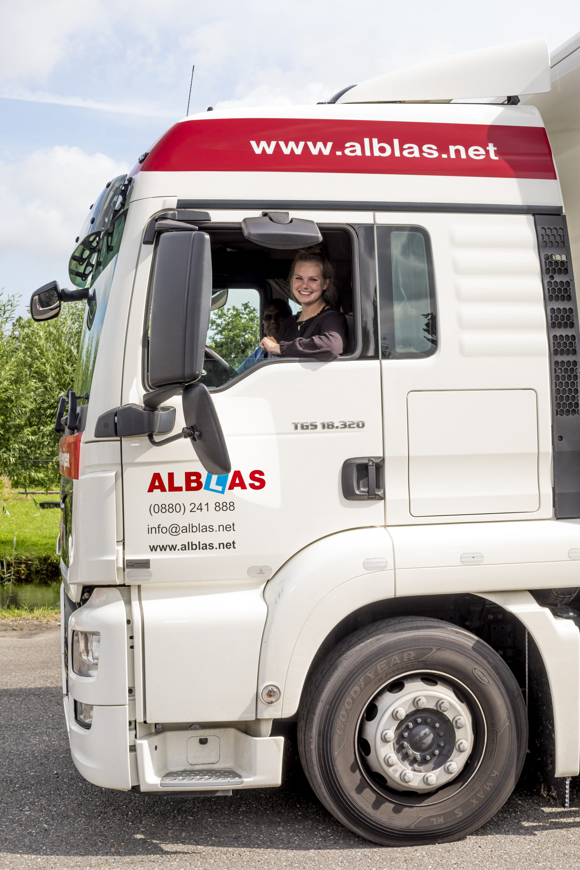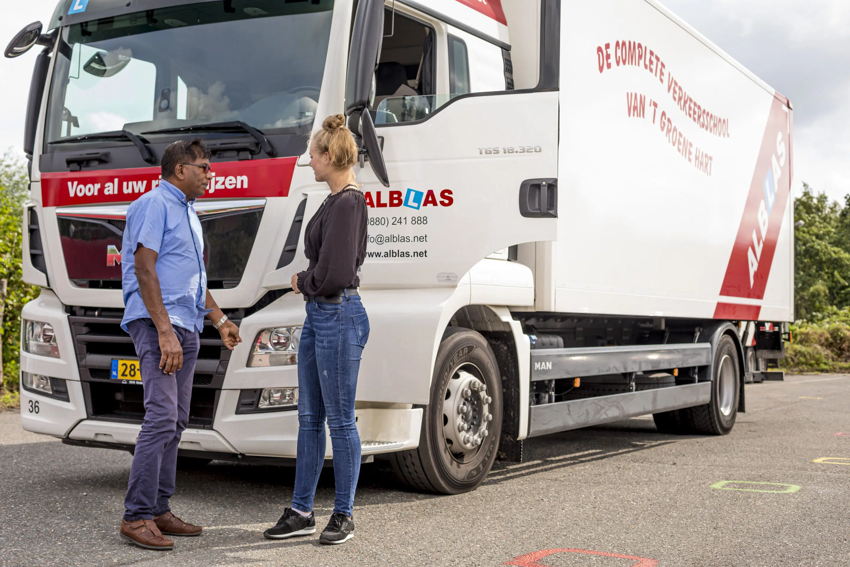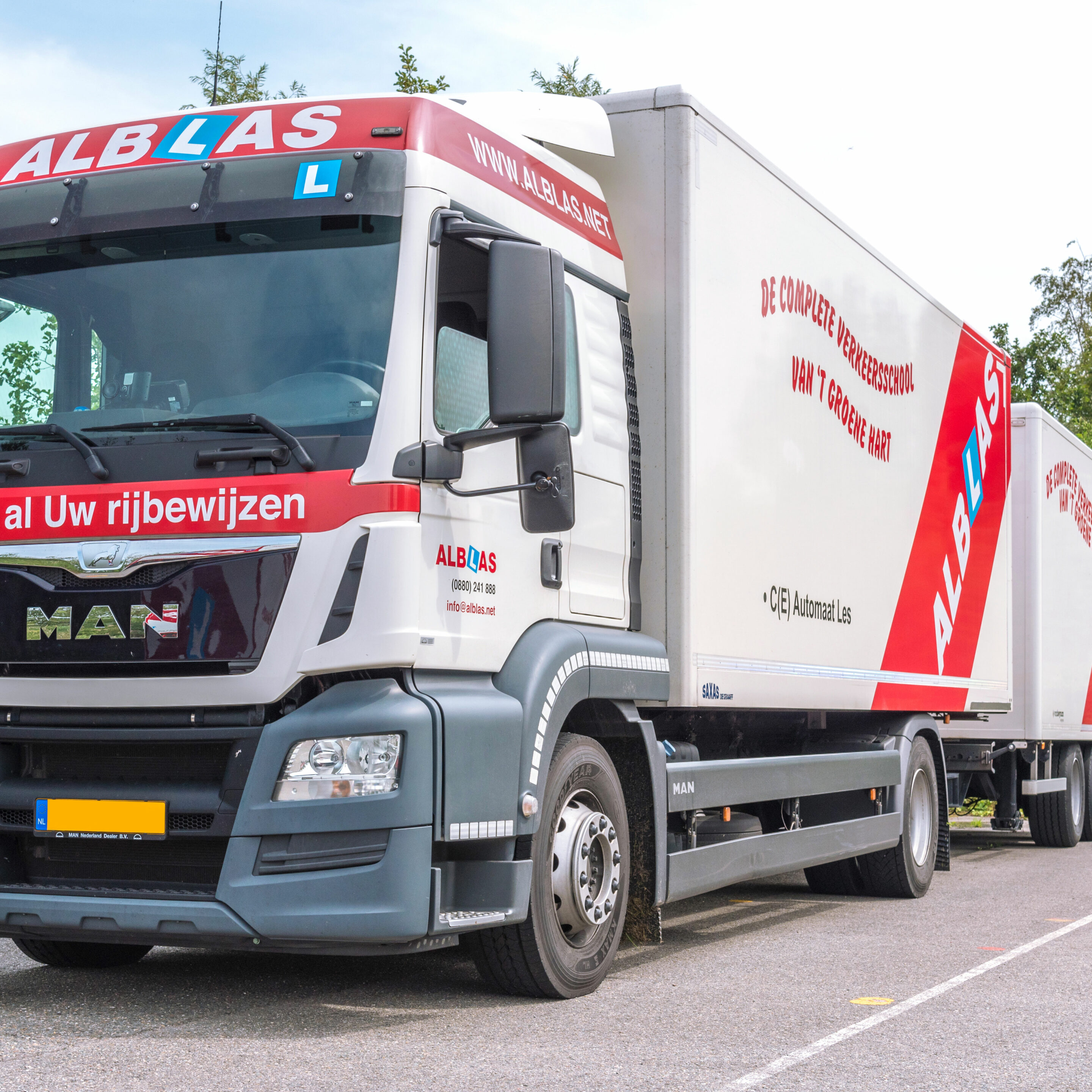 “Wil jij je vrachtwagenrijbewijs C halen of heb je vragen? Neem contact met ons op via: 088 - 024 18 88 (toets 3) of stuur een mail naar beroepsvervoer@alblas.net.” We zitten in de buurt van Woerden.